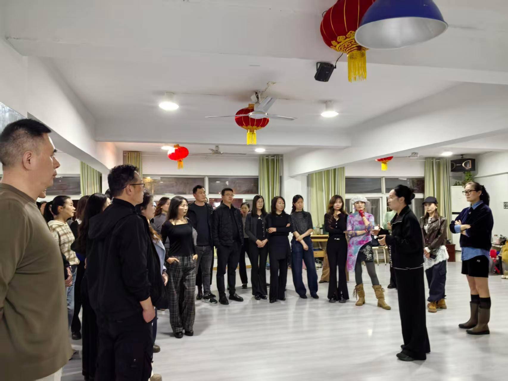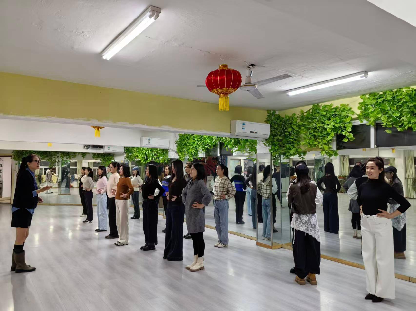根据队员基础,当晚训练分两组进行。贾楠负责提升班,她一边示范一边讲解:“丁字步造型,气向下沉,肚脐下三指绷紧,额头向上提,左脚脚跟内扣,脚尖不动——头立起来,收腹提腰。”另一间训练室里,刘斐元正带领基础组学员从零打磨基本功。“台步——提腿、出腿、落脚,注意落脚位置。”她口令清晰,边讲边示范。