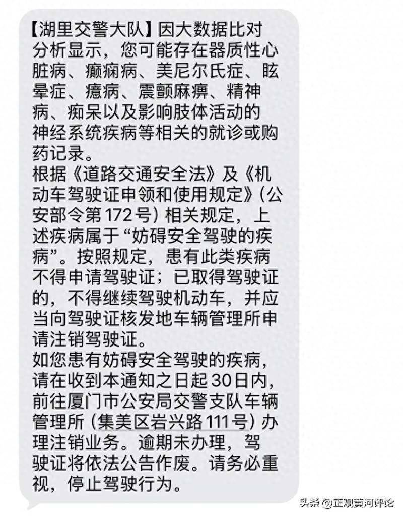 随后,厦门市湖里区交警部门回应称,该短信只是提醒,意在引导驾驶员前往核验,若情况不实,只需签署承诺书或提供医院证明即可。